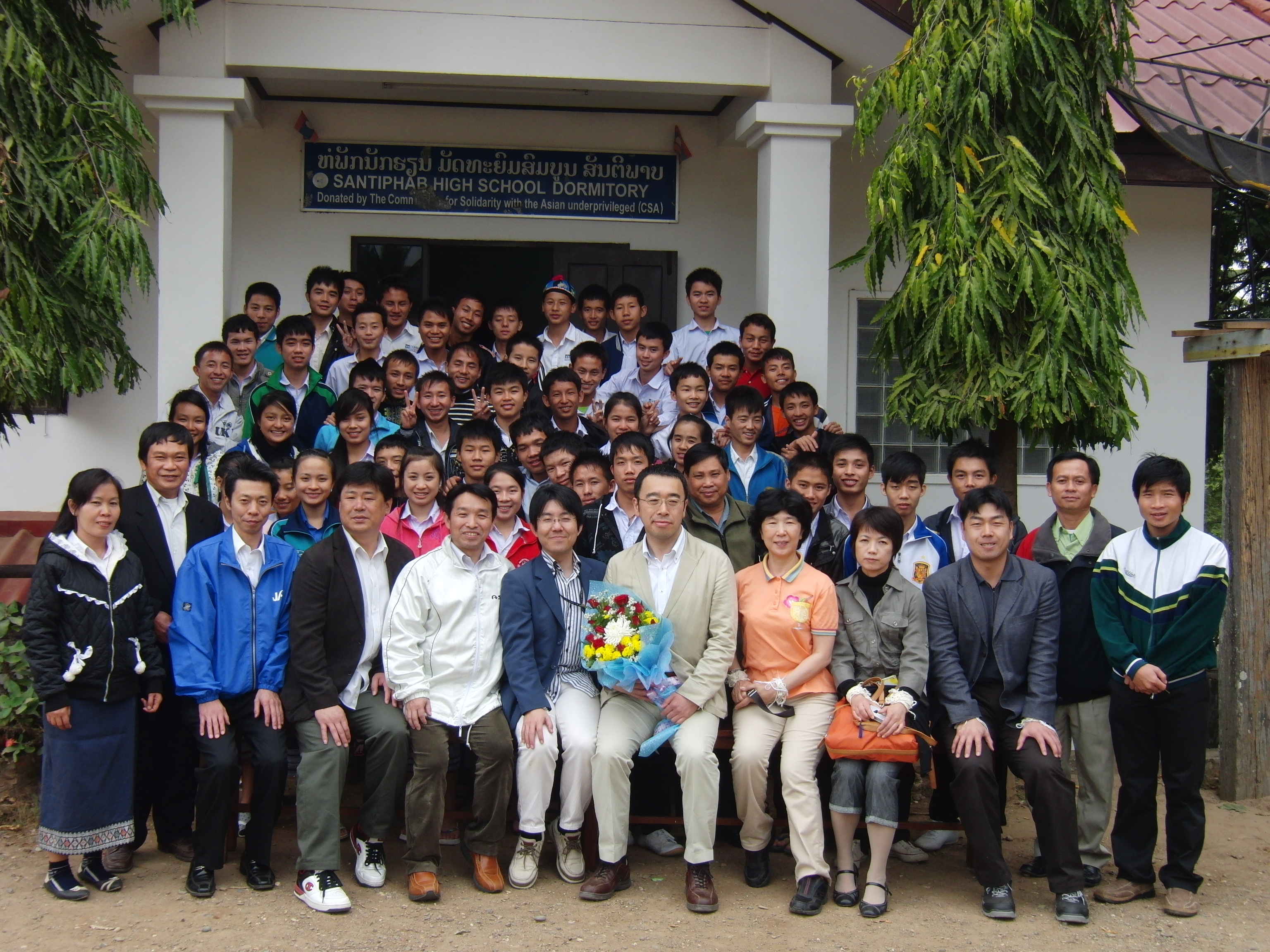 ラオスでは、関係省庁への表敬訪問、CSAが建設寄贈した小学校2校、遠隔地高校生支援のための高校寮を訪問し、小学校では校舎点検のほか文具や運道具の寄贈、さらには綱引きを行い、村人や子どもたちと交流しました。高校寮では寮生たちに救援衣類や文具を手渡し、生徒たちによるラオスの伝統舞踊を見学後、舞踊を習いつつともに踊る、意見交換などをつうじて友好を深めました。
