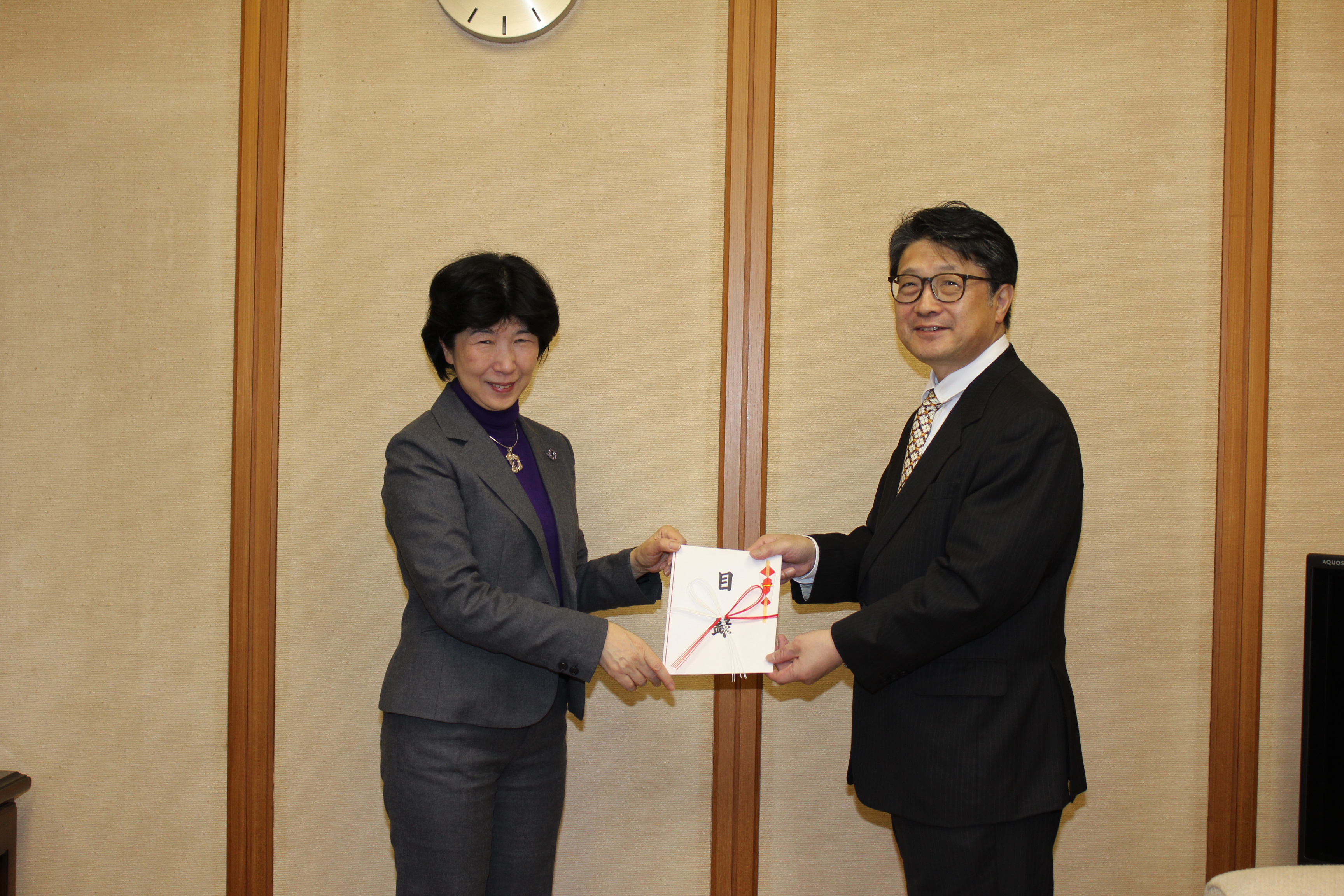 逢見UAゼンセン会長からカンパ金目録を受け取る渡邉事務局長 担当の滝澤UAゼンセン常任中執と共に