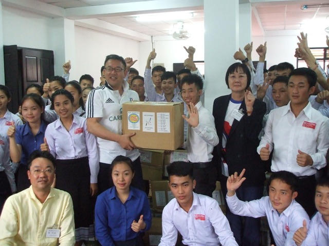 1月19日(木)、ルアンプラバン県のサンティパープ高校生寮を訪問し、寮生に救援衣類50箱を引き渡しました。