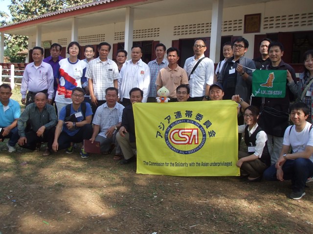 1月15日(月)午前、ラオスのビエンチャン県ファサン村小学校(24番目校)を訪問しました。同校は生徒が794名もいる大規模校で、基幹労連がCSAを通して、2014年に寄贈した校舎は、きれいに使われていました。また、同行の要望により2015年に基幹労連が寄贈した井戸の確認もしました。その際、校長は「井戸水は乾季に汲みあげて、水道水として使っている」との説明を受けました。さらに、メンバーは、文房具やボール等の土産を学校に渡し、生徒と折紙教室をしたり、綱引きをして交流しました。
