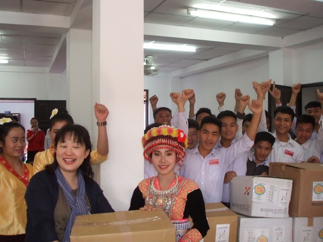 1月18日(木)、ルアンプラバン県のサンティパープ高校生寮を訪問し、寮生に衣類50箱を引き渡しました。