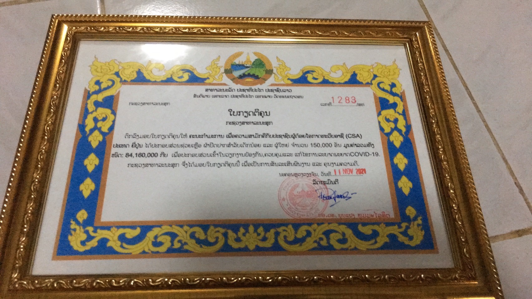 既報のとおりアジア連帯委員会(CSA) は救援衣類の代替支援としてラオスへ150,000枚 (2021年11月) タイへ150,000枚 (2021年12月)の不織布マスクを寄贈しました。この支援活動に対する感謝状が、にラオス保健省並びにタイ社会開発福祉省から届きました。