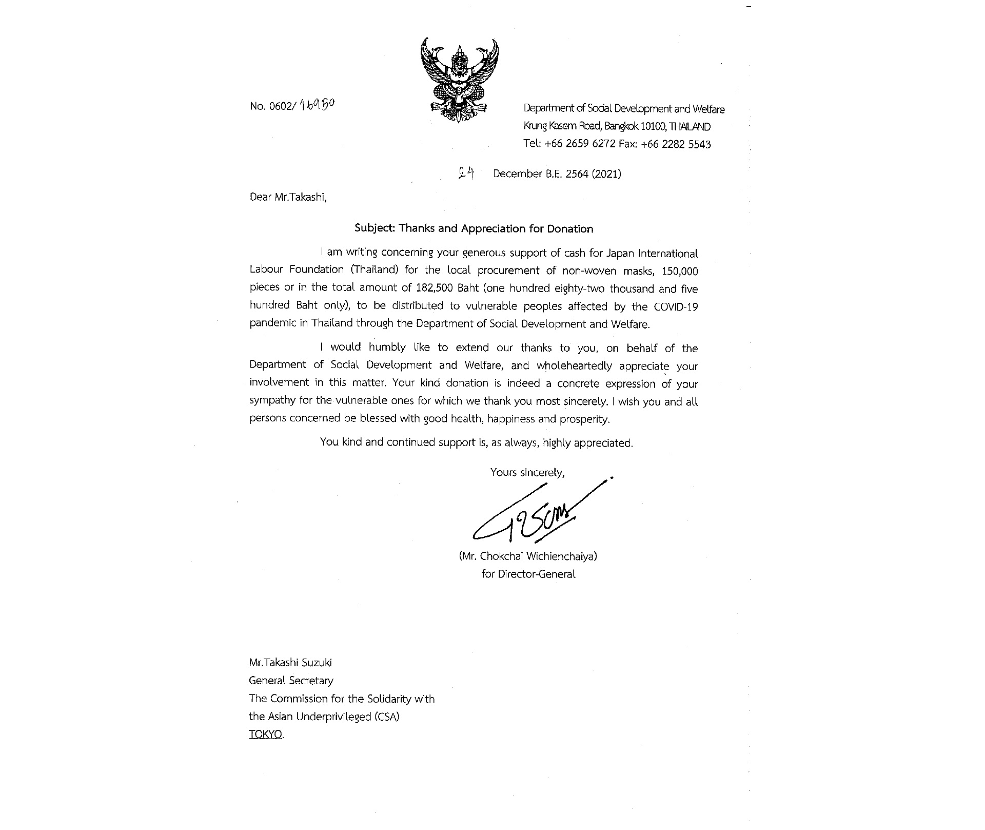 ラオス・タイ両政府からの感謝状の骨子は『CSAの支援に担当省を代表して衷心より感謝を申し上げます。この度の不織布マスクは、新型コロナウイルスのパンデミック等により国内の困窮する人々に配布してまいります。CSAの継続的な慈悲深い支援は高く評価され、そして感謝されています。私たちはCSAに関係する全ての皆様の健康と幸福そして繁栄を願っています。今後ともよろしくお願いいたします』
