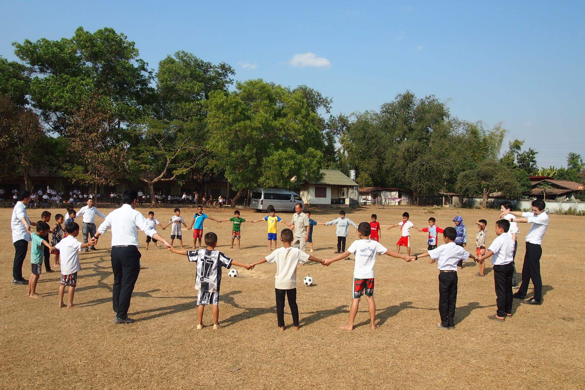 午後からは、車で約1時間のところに位置するホンガム村小学校を訪問。ここは1996年にCSAが建設、その後、3回にわたって屋根などの修理をしています。メインは子供達との交流なので、サッカー班と折り紙班に分かれて自由に遊びました。広いグラウンドを裸足で新しいボールを追いかける子供たちは実に楽しそう、砂ぼこりまみれになったメンバーも達成感があったようです。次回は動きやすい服装にしましょう。