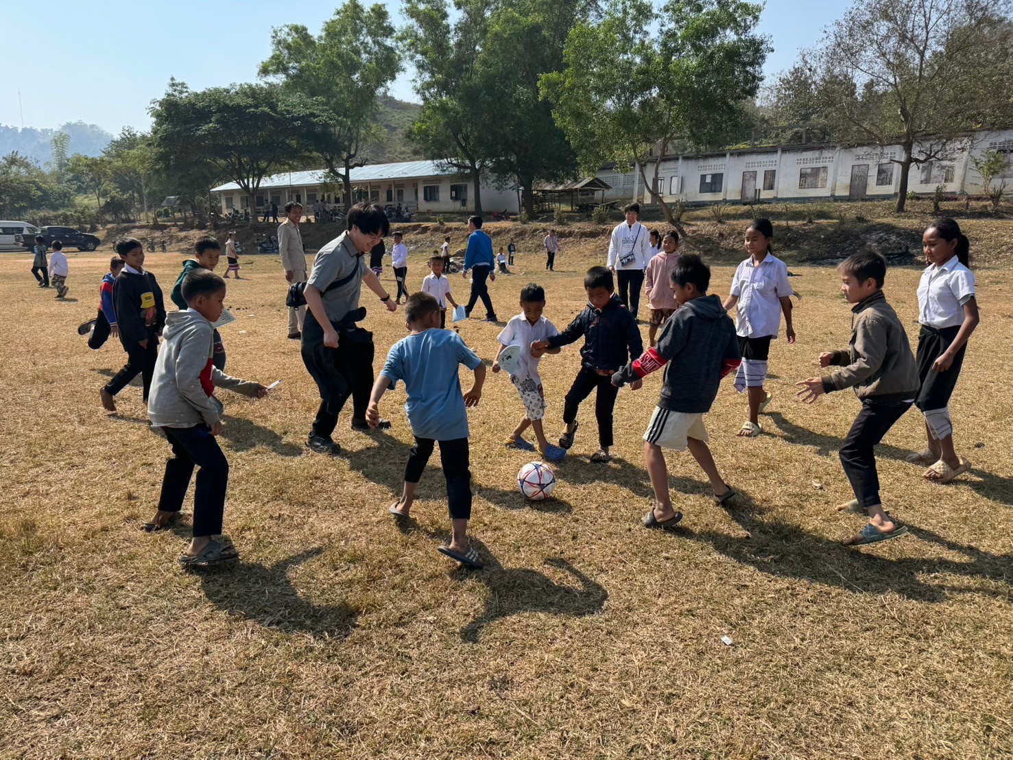 現地では、100名あまりの子供たちが盛大に迎えていただきました。CSAからは、ノート・ボールペン・サッカーボール・バレーボール・折り紙等プレゼンし子供たちと交流しました。子供たちのキラキラした眼差しが印象に残りました。