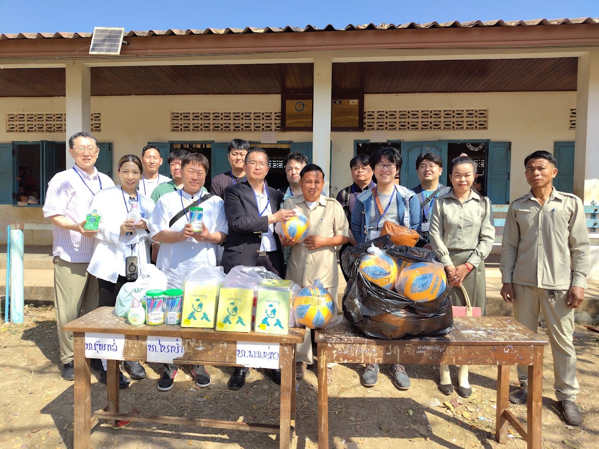 ファサン村小学校で先生方と ナカン村小学校で文房具プレゼント 子供達との交流