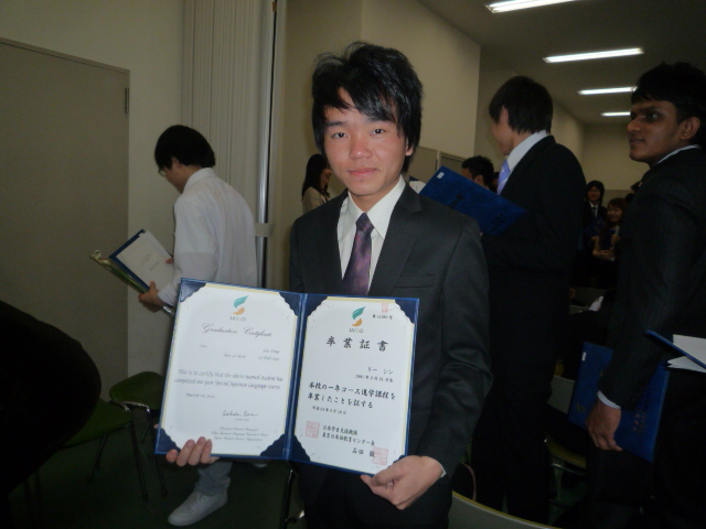 2012年3月16日(金)、日本学生支援機構・東京日本語教育センターにおいて、昨年4月に来日し、現在、日本語習得中のラオス留学生(サンティパープ高校寮5期生)、チュー・チャン君とシン・リー君の2名が日本語研修を終え、無事に卒業証書を手にした。なお、チューチャン君は皆勤賞も授与した。