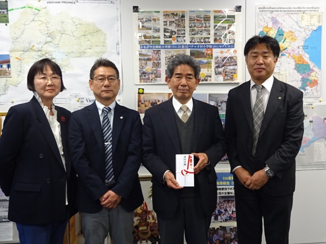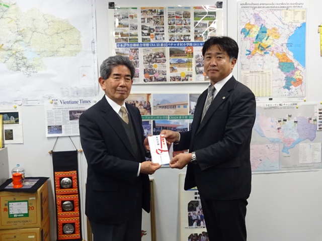 3月19日(月)、アジア連帯委員会は、住友重機械労連から多額の「高校生支援募金」をいただきました。この日は、宮沢委員長と酒井総務部長、仲横須賀支部書記長が来局し、吉井会長に「ラオス高校生支援募金として金25万円、組合員の善意を寄付致します」という「目録」を手渡しました。