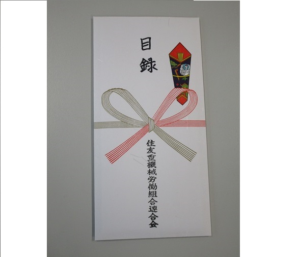 住友重機械労連からの募金目録 弥久末委員長から募金を受ける澤田会長