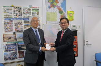 友愛会館内のCSA事務所に弥久末委員長と土岐総務組織部長が来局し、澤田会長に「ラオス高校生支援募金として金8万円、組合員の善意を寄付致します」という「目録」を手渡しました。