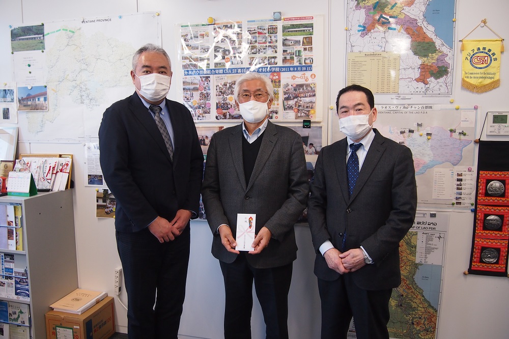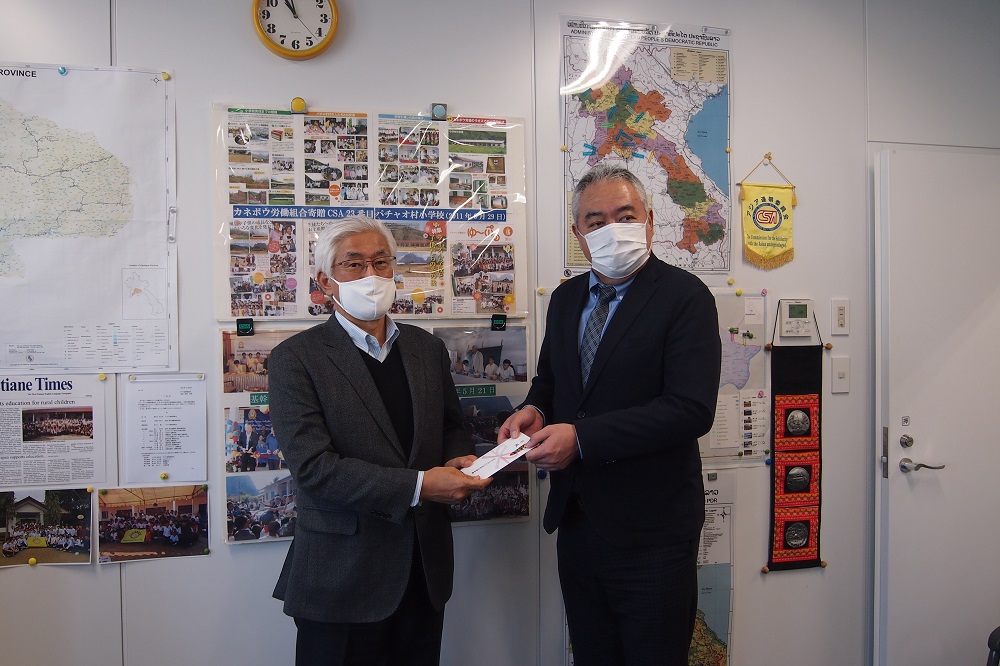 3月4日(木)、アジア連帯委員会は、住友重機械労連からラオスの高校生寮支援募金を頂きました。東京芝のCSA事務所に町田副委員長と土岐総務組織部長が来局し、澤田会長に「ラオス高校生支援募金として金8万円、組合員の善意を寄付致します」という「目録」を手渡しました。