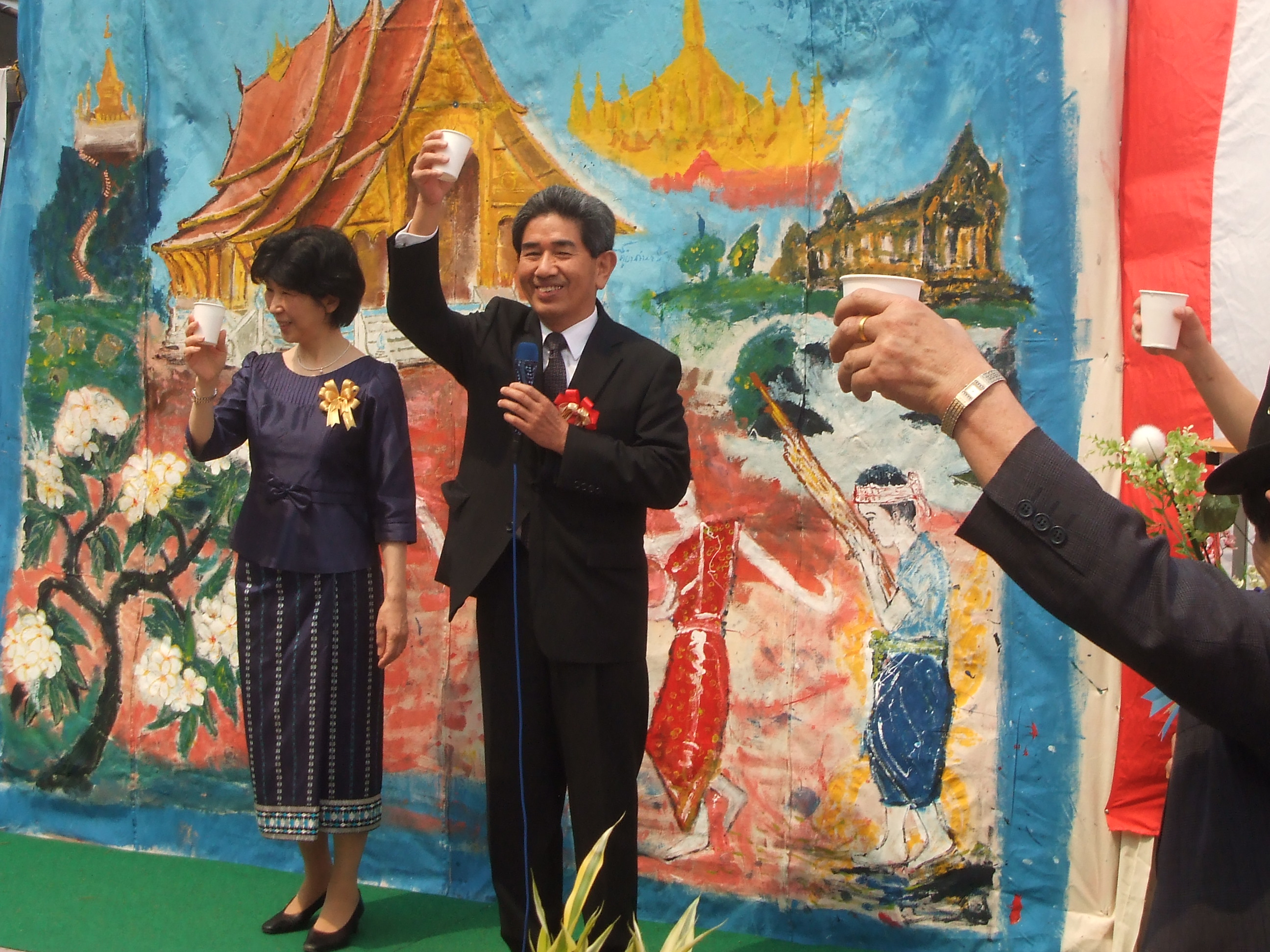 乾杯の音頭をとる吉井CSA会長 ラオス大使等来賓と 新岡・在日ラオス協会事務局長の司会で舞踊披露
