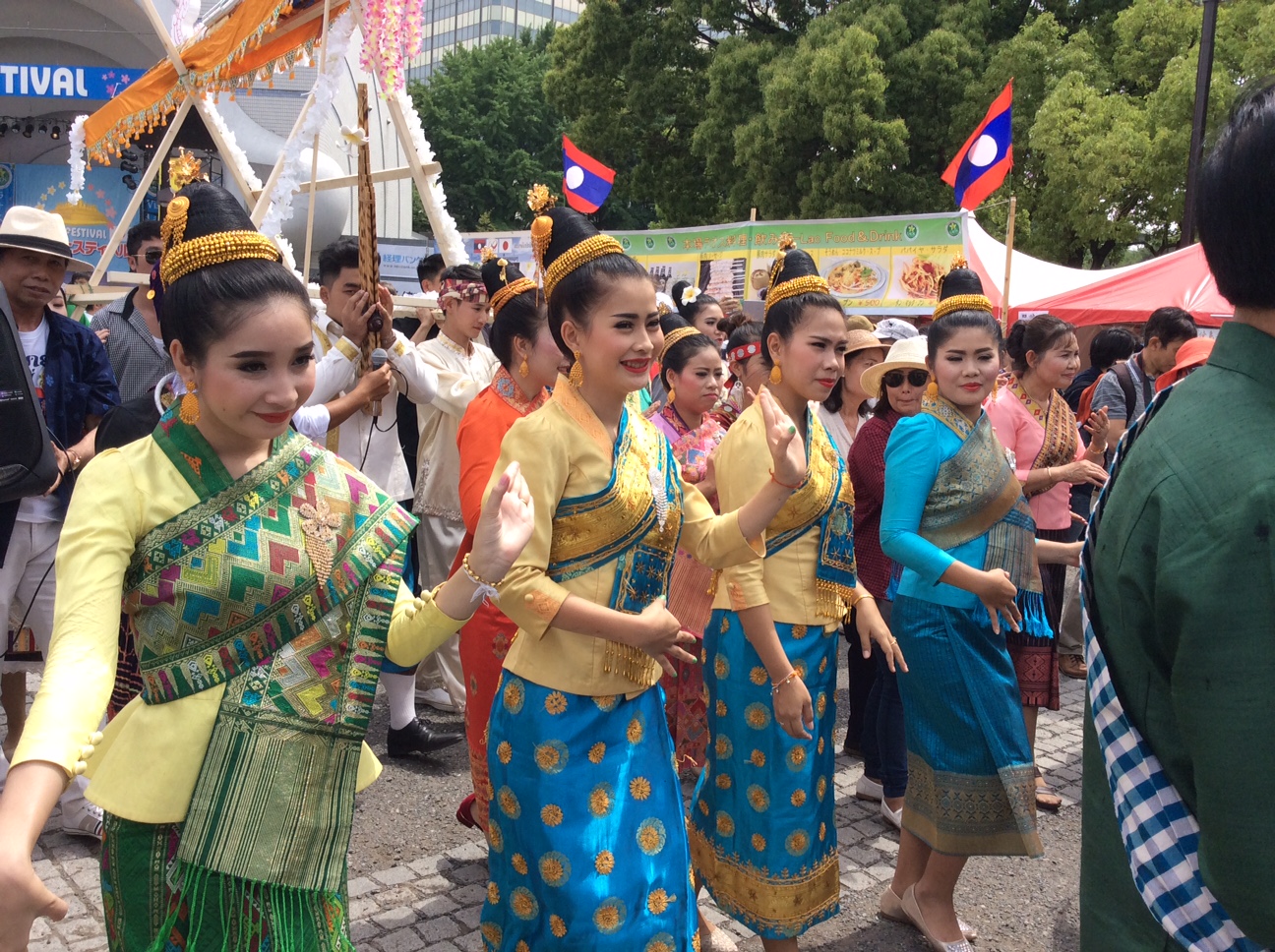 スンダラー大使による開会宣言、観光大臣、来賓等の挨拶、ラオス伝統音楽と舞踊の披露後、祭典がスタートしました。ラオス文化・観光の紹介展示ブース、幸運を祈るバーシー儀式、ラオス留学生によるラオス料理講座などラオスの紹介が会場各所で展開され、またフードブースなどで販売されたラオスの料理や飲み物などが雰囲気を盛り上げ、またラオス舞踊を先頭に踊りのパレードが公園内を練り歩き、両日総計約20万人強の参加者は華やかな祭典を楽しみました。