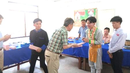 その後、卒寮生より歌や歓迎の舞が披露され、卒寮生全員にCSAロゴ入りのボールペンを贈呈、また、過日実施された試験でラオス国内トップを獲得した学生と優秀な成績を収めた3名には、記念品をプラスしました。残る時間を学生たちと私たちのコミュニケーションに充てたところ、日本にたいへん関心があることをあらためて痛感しました。支援していくうえでのヒントになると考えます。