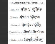 ※目印のCSAシールと、日本語/タイ語/ラオス語の内容表示表はページ下部のリンクからダウンロードでしてご使用いただけます。また、HPの「救援衣類を送る運動」からもリンクできます。