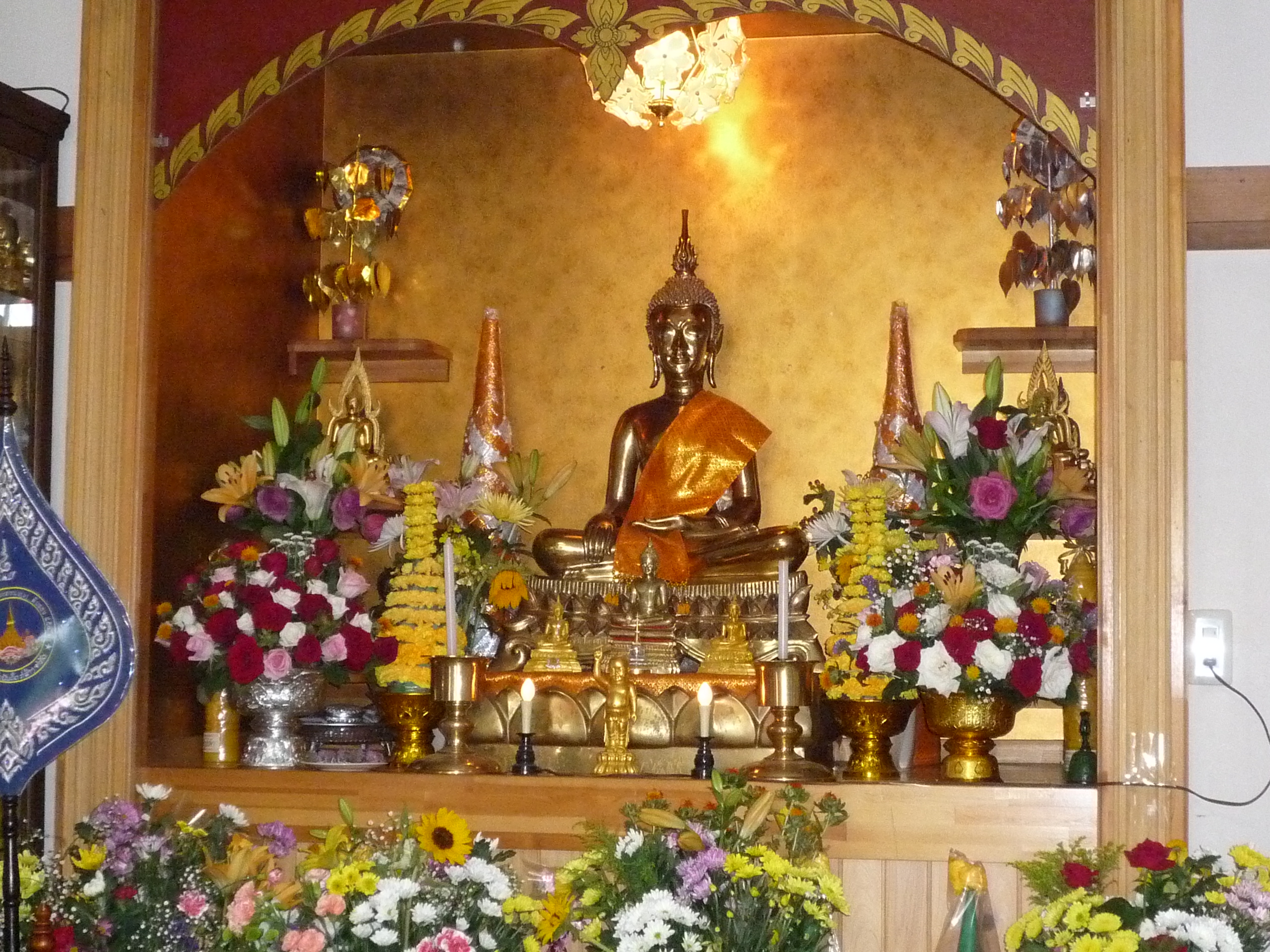 ヴィエンチャンから来日された高僧 在日本ラオス協会久永会長、新岡事務局長と お寺を兼ねたラオス文化協会内のご本尊