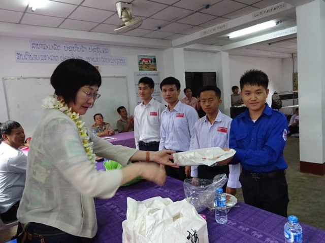 5月18日(水)は、サンティパープ高校CSA寮で、第12期生30名の卒寮式に出席し、卒寮生に記念品を、ラオス全国試験での成績優秀者4名にお祝いの品を手渡しました。さらに、水道とトイレの補修状況について視察するとともに、学校関係者と意見交換を行いました。