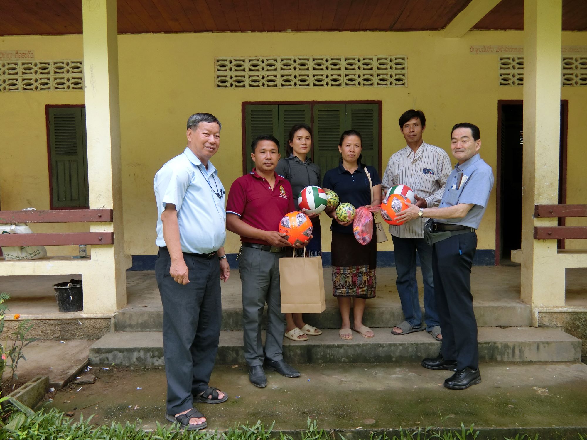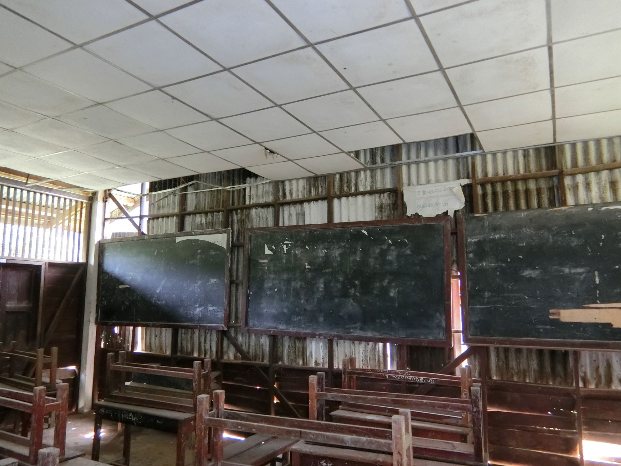 山間部のパホム村小学校 教室内の破損した天井 サッカーボールなど贈呈