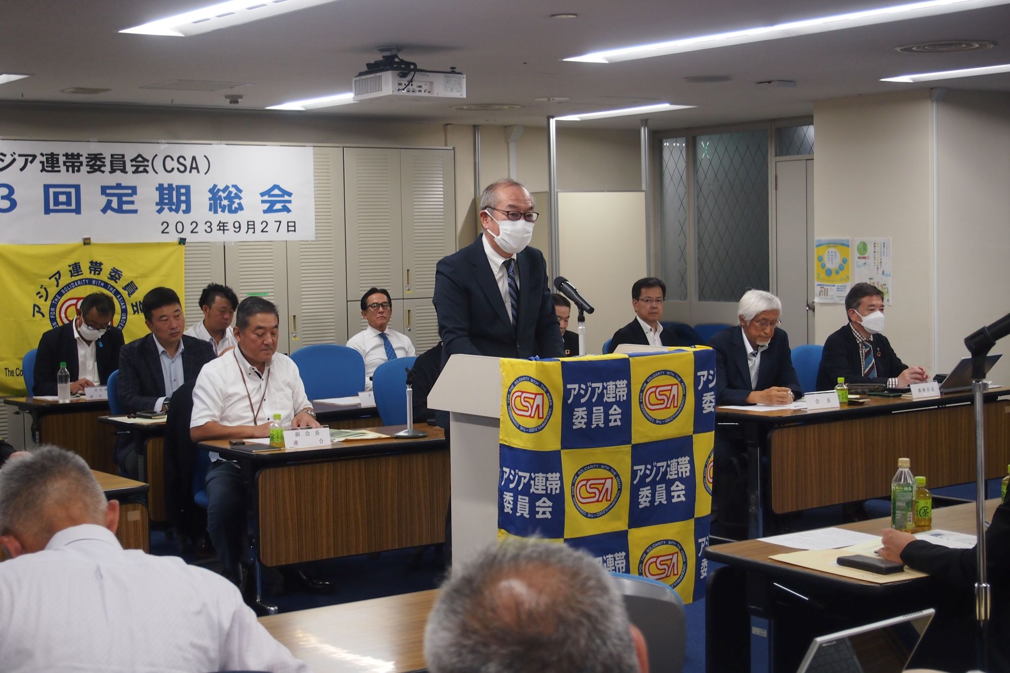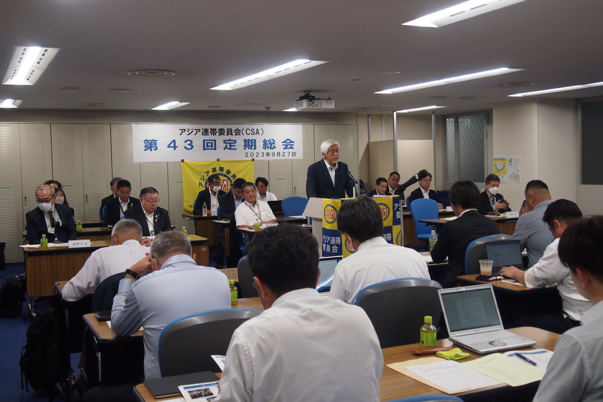 9月27日、連合本部においてアジア連帯委員会(CSA)第43回定期総会を開催しました。コロナ感染症が5類に引き下げられたこともあり、例年になく沢山の評議員にご参集いただき華やかな総会となりました。冒頭、澤田会長は、団体・個人会員の皆様の物心両面のお支えにより事業が継続できていることへの感謝と、三本の柱である主要事業について触れられました。ご来賓には連合本部 清水事務局長、国際労働財団 小川副事務長より激励のご挨拶を受けました。また、CSA元副会長の渡邉様にも傍聴としてご臨席いただきました。