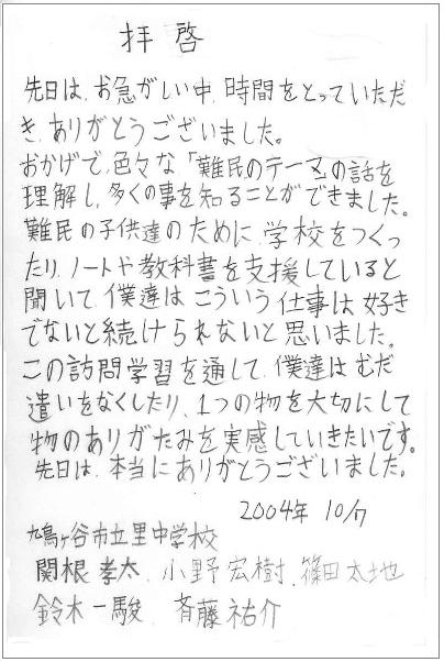 10月5日、午前、難民の子供たちがどのような暮らしをしているのか知りたいと、鳩ヶ谷市立里中学校(埼玉県)の三年生、5人の訪問を受けました。