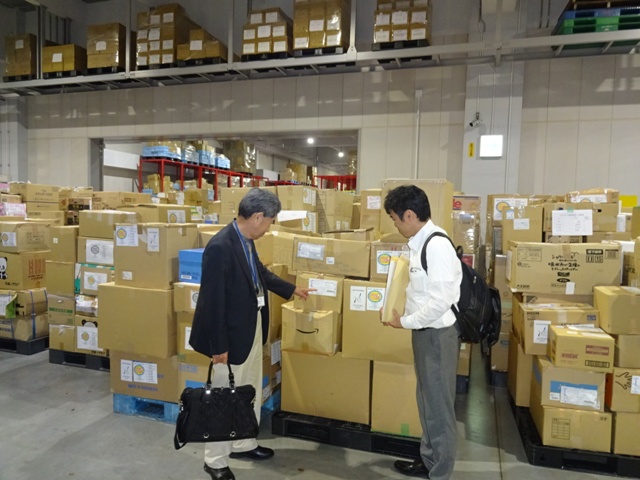 集荷した衣類 倉庫視察した事務局 セイノー通関の説明